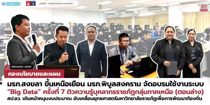 วันที่ 8-9 มกราคม 2569 ผศ.พิเชษฐ์ จันทวี อธิการบดีมหาวิทยาลัยราชภัฏสงขลา (มรภ.สงขลา) มอบหมายให้ ทีมบุคลากรงานนโยบายและยุทธศาสตร์ กองนโยบายและแผน สำนักงานอธิการบดี มรภ.สงขลา ประกอบด้วย นางสโรชา บริสุทธิ์ นักวิเคราะห์นโยบายและแผนชำนาญการ นางกฤชณัท พงศ์จันทรเสถียร และ นางวิภาวี โสตถิพันธุ์ เจ้าหน้าที่บริหารงานทั่วไป จัดโครงการอบรมเชิงปฏิบัติการการใช้งานระบบบริหารจัดการข้อมูลขนาดใหญ่ (Big Data) เพื่อขับเคลื่อนยุทธศาสตร์มหาวิทยาลัยราชภัฏเพื่อการพัฒนาท้องถิ่น ครั้งที่ 7 ณ ห้อง COMPUTER LAB 106 ชั้น 1 สถาบันเทคโนโลยีดิจิทัล มหาวิทยาลัยราชภัฏพิบูลสงคราม (ส่วนทะเลแก้ว) จังหวัดพิษณุโลก ในการนี้ ผศ.ดร.ชุมพล เสมาขันธ์ อธิการบดี มรภ.พิบูลสงคราม ได้มอบหมายให้ รศ.ดร.โชติ บดีรัฐ รองอธิการบดีฝ่ายแผนและยุทธศาสตร์ เป็นประธานในพิธีเปิด