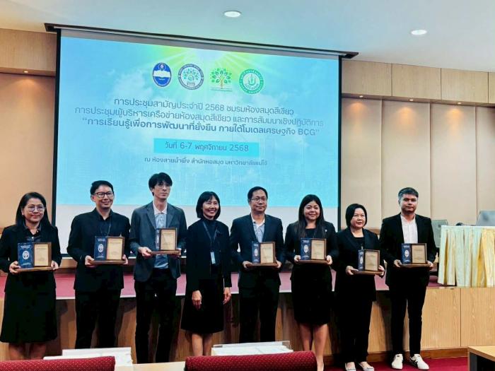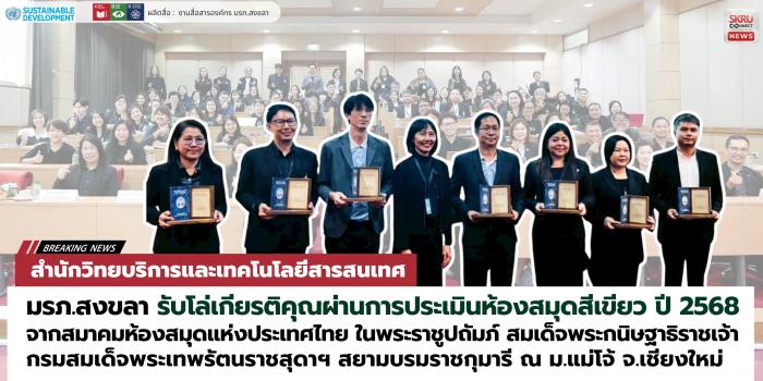 สำนักวิทยบริการฯ มรภ.สงขลา รับโล่เกียรติคุณผ่านการประเมินห้องสมุดสีเขียว ประจำปี 2568 จากสมาคมห้องสมุดแห่งประเทศไทย ในพระราชูปถัมภ์ สมเด็จพระกนิษฐาธิราชเจ้า กรมสมเด็จพระเทพรัตนราชสุดาฯ สยามบรมราชกุมารี เมื่อวันที่ 6 พฤษภาคม 2568 สำนักวิทยบริการและเทคโนโลยีสารสนเทศ มหาวิทยาลัยราชภัฏสงขลา (มรภ.สงขลา) โดย ผศ.ปิยกุล จันทบูรณ์ รองผู้อำนวยการสำนักวิทยบริการและเทคโนโลยีสารสนเทศ เป็นผู้แทนรับโล่เกียรติคุณ ?ห้องสมุดสีเขียว ประจำปี พ.ศ. 2568? ซึ่งผ่านการประเมินตามมาตรฐานห้องสมุดสีเขียว ประจำปี พ.ศ. 2568 จัดโดย ชมรมห้องสมุดสีเขียว สมาคมห้องสมุดแห่งประเทศไทย ในพระราชูปถัมภ์ สมเด็จพระกนิษฐาธิราชเจ้า กรมสมเด็จพระเทพรัตนราชสุดาฯ สยามบรมราชกุมารี ในการประชุมสามัญประจำปี 2568 ชมรมห้องสมุดสีเขียว การประชุมผู้บริหารเครือข่ายห้องสมุดสีเขียว และการสัมมนาเชิงปฏิบัติการ การเรียนรู้เพื่อการพัฒนาที่ยั่งยืน ภายใต้โมเดลเศรษฐกิจ BCG ณ ห้องสายน้ำหนึ่ง สำนักหอสมุด มหาวิทยาลัยแม่โจ้ จังหวัดเชียงใหม่ ทั้งนี้ โล่ประกาศเกียรติคุณฯ ประจำปี 2568 มีความพิเศษตรงมีลักษณะเป็นรูปหนังสือเสมือนจริง และผลิตจากพลาสติกรีไซเคิล ซึ่งเป็นผลงานของวิสาหกิจชุมชน YOLO (You Only Live Once) ส่วนโครงโล่ผลิตจากเศษผ้าฝีมือของช่างไม้ชุมชนในจังหวัดปราจีนบุรี เพื่อสื่อถึงการให้ความสำคัญกับการรักษาสิ่งแวดล้อมอย่างแท้จริง