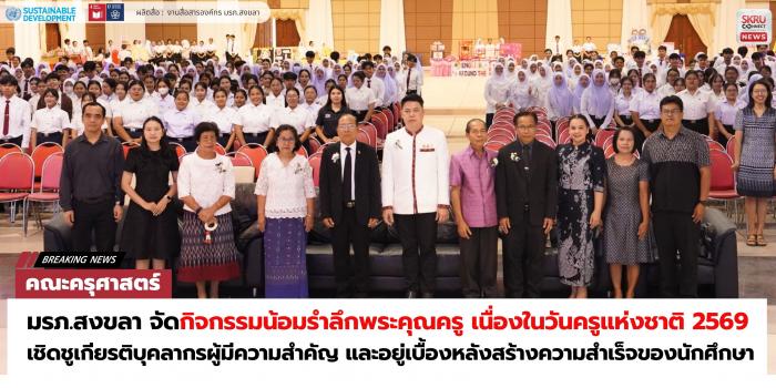 คณะครุศาสตร์ มรภ.สงขลา จัดกิจกรรมน้อมรำลึกพระคุณครู เชิดชูเกียรติผู้อยู่เบื้องหลังสร้างความสำเร็จนักศึกษา เมื่อวันที่ 16 มกราคม 2569 คณะครุศาสตร์ มหาวิทยาลัยราชภัฏสงขลา (มรภ.สงขลา) จัดกิจกรรมน้อมรำลึกพระคุณครู (คคศ.) เนื่องในโอกาสวันครูแห่งชาติ 16 มกราคม ณ หอประชุมเฉลิมพระเกียรติฯ มรภ.สงขลา เพื่อน้อมรำลึกพระคุณครู เชิดชูเกียรติบุคลากรผู้มีความสำคัญ และเป็นผู้อยู่เบื้องหลังในการสร้างความสำเร็จของนักศึกษา โดยมี ผศ.ดร.โสภณ ชัยวัฒนกุลวานิช คณบดีคณะครุศาสตร์ เป็นประธานในพิธีเปิด นอกจากนั้น ยังได้รับเกียรติจากอดีตอธิการบดี คือ ผศ.ดร.ไพโรจน์ ด้วงวิเศษ เข้าร่วมในพิธี และ อาจารย์ ดร.มนตรี เด่นดวง อดีตคณบดีคณะครุศาสตร์ เป็นผู้บรรยายให้ความรู้เกี่ยวกับบทบาท ความสำคัญ และหน้าที่ของครู ผศ.ดร.โสภณ ชัยวัฒนกุลวานิช กล่าวว่า คณะครุศาสตร์ จัดงานน้อมรำลึกพระคุณครูครุศาสตร์ เพื่อระลึกถึงพระคุณครู ผู้ประกอบวิชาชีพครูตามมาตรฐานวิชาชีพครูด้วยมาตรฐาน 3 ด้าน คือ 1. มาตรฐานความรู้และประสบการณ์วิชาชีพ 2. มาตรฐานการปฏิบัติงาน และ 3. มาตรฐานการปฏิบัติตน และมีความภาคภูมิใจในวิชาชีพครู ซึ่งผู้เข้าร่วมโครงการเป็นคณาจารย์ประจำของมหาวิทยาลัยและนักศึกษาหลักสูตรครุศาสตรบัณฑิตที่จะไปเป็นครูผู้สอนในอนาคต กิจกรรมภายในงานประกอบด้วย การจัดนิทรรศการเกี่ยวกับวันครู การบรรยายในหัวข้อ ?ผู้ประกอบการวิชาชีพครูที่มีความภาคภูมิใจในวิชาชีพครู? โดย อาจารย์ ดร.มนตรี เด่นดวง และการบรรยายในหัวข้อ ?จรรยาบรรณวิชาชีพครู (E-PLC)" นับเป็นสิ่งที่น่ายินดีอย่างยิ่งสำหรับผู้เข้าร่วมโครงการทุกคนที่มีโอกาสได้ร่วมกันระลึกถึงพระคุณบูรพาจารย์ และฟังการบรรยายจากวิทยากรซึ่งเป็นอธิการบดี มรภ.สงขลา และอดีตคณบดีคณะครุศาสตร์ ขอแสดงความชื่นชมกับความตั้งใจ ความร่วมมือกันระหว่างคณะผู้บริหาร คณาจารย์ นักศึกษา และผู้เข้าร่วมโครงการ ที่ตระหนักถึงความสำคัญของการส่งเสริมศิลปวัฒนธรรมและความเป็นไทย และการส่งเสริมคุณลักษณะบัณฑิตตามมาตรฐานการเรียนรู้ ตามกรอบมาตรฐานคุณวุฒิแห่งชาติ 5 ประการ ให้ครบถ้วนและครอบคลุมมาตรฐานการศึกษา ตลอดจนเป็นการสืบสานและอนุรักษ์ประเพณีที่ดีงามให้คงอยู่สืบไป นอกจากนั้น ภายในงานยังมีการอ่านสารวันครู กล่าวคำฉันท์ระลึกพระคุณครู การมอบเกียรติบัตรเชิดชูเกียรติแก่คณาจารย์ บุคลากร นักศึกษา และครูโรงเรียนสาธิตมหาวิทยาลัยราชภัฏสงขลา โดย ผศ.ดร.โสภณ ชัยวัฒนกุลวานิช คณบดีคณะครุศาสตร์ ซึ่งการมอบเกียรติบัตรในครั้งนี้ถือเป็นการสร้างข