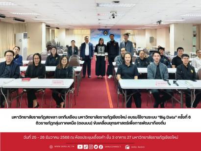 กองนโยบายและแผน สำนักงานอธิการบดี มรภ.สงขลา ยกทีมขึ้นเหนือเยือน มรภ.เชียงใหม่ เดินหน้าจัดอบรมการใช้งานระบบบริหารจัดการข้อมูลขนาดใหญ่ ?Big Data? ครั้งที่ 6 ติวความรู้บุคลากรราชภัฏกลุ่มภาคเหนือ (ตอนบน)...